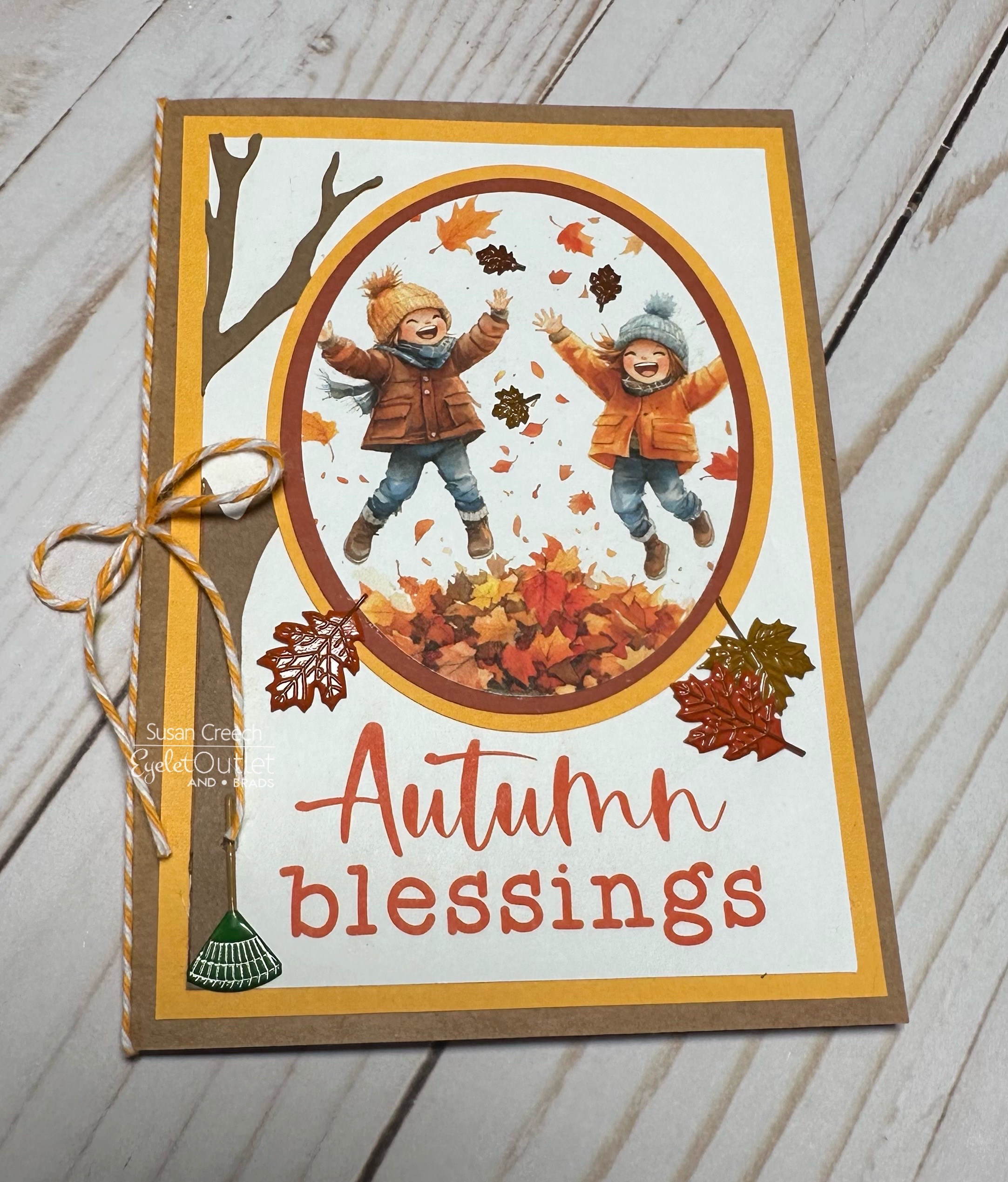 I embellished the card with the mini version of the leaf brads as well as a few of the standard size ones. I also leaned a little rake brad up against the tree.